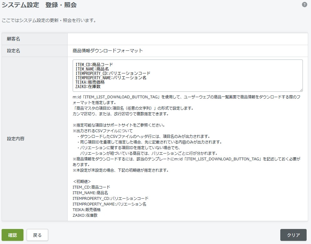 ユーザーウェブの商品一覧ページ(item_list.xhtml)で商品情報をダウンロードする際のフォーマットを指定します。