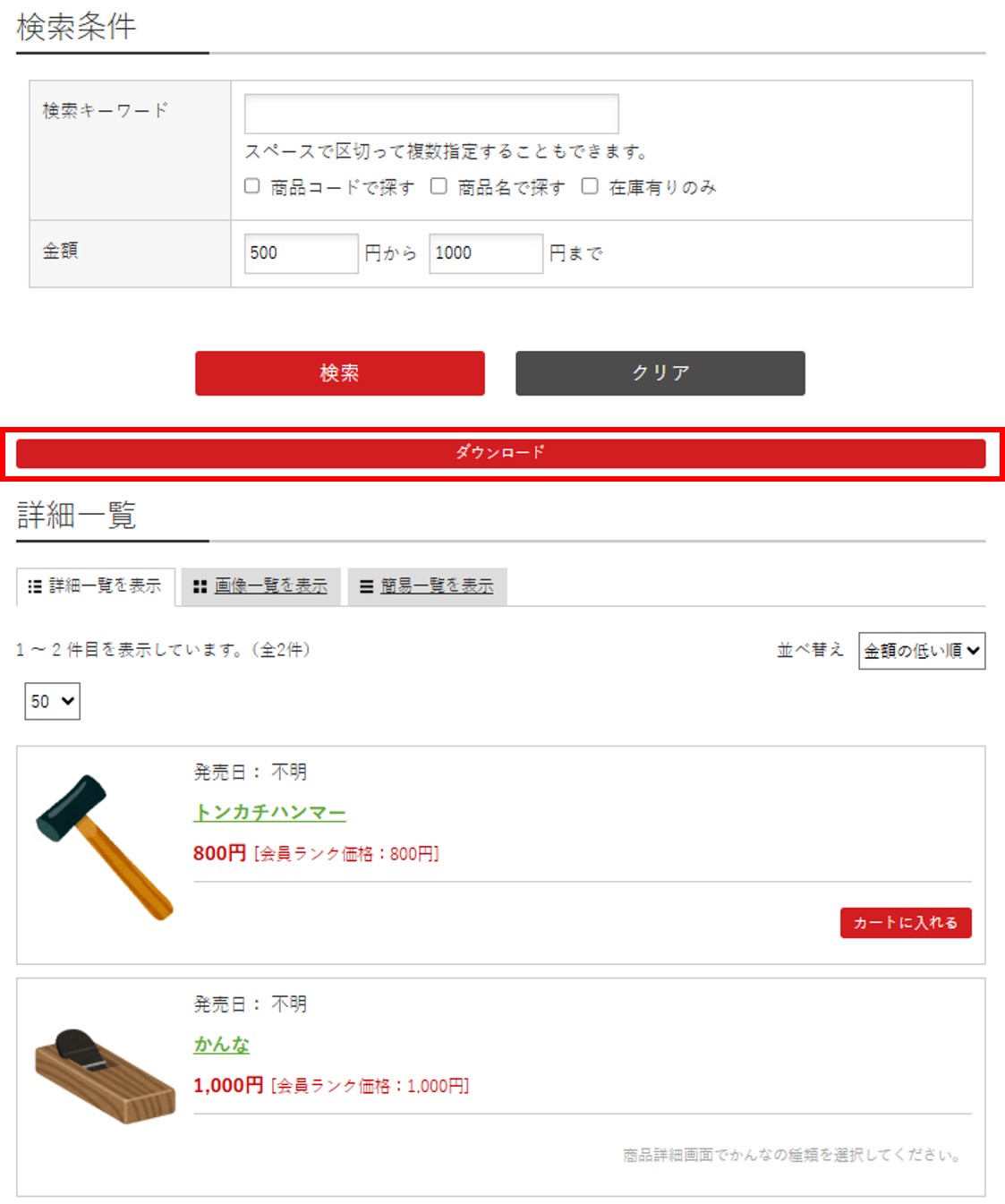 商品一覧ページ(item_list.xhtml)で、条件を検索し、[ダウンロード]ボタンを押すと、CSVファイルをダウンロードできます。