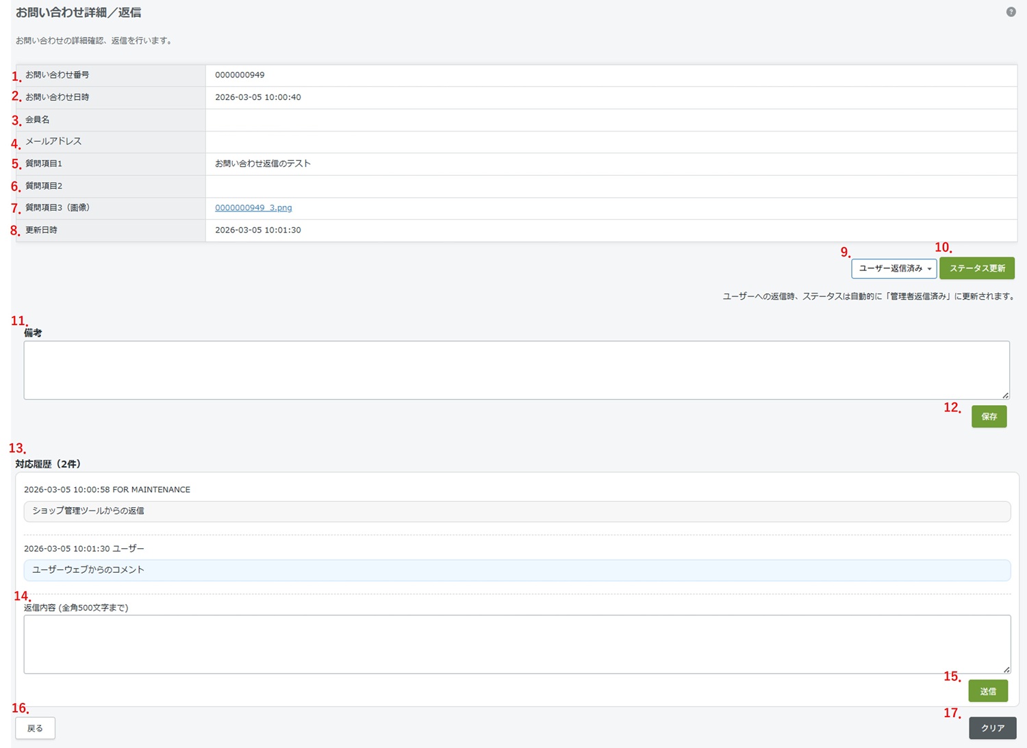 ・返信コメントは、1つのお問い合わせ投稿につきユーザーウェブ、ショップ管理ツールからの送信を合わせて