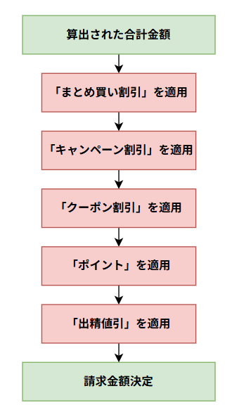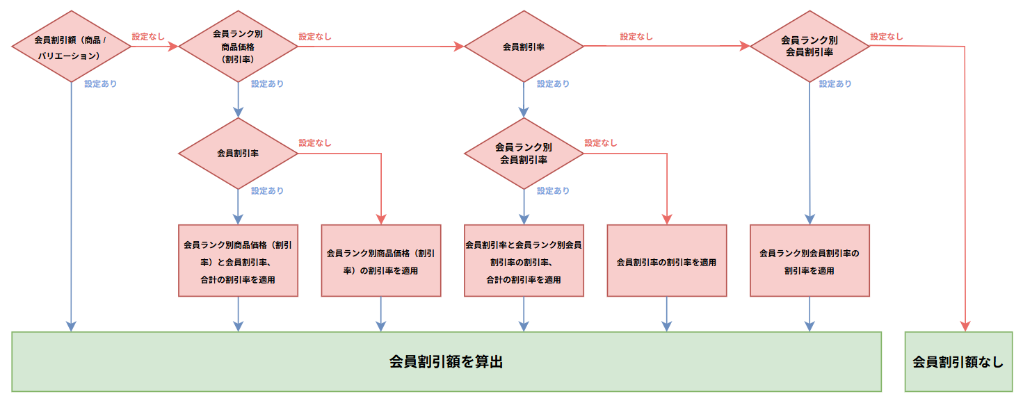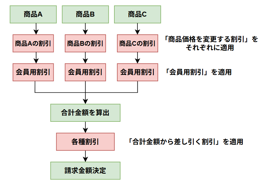 基本的な考え方としては、まず「商品価格を変更する割引」と「会員用割引」で、各商品の合計額を決定し、