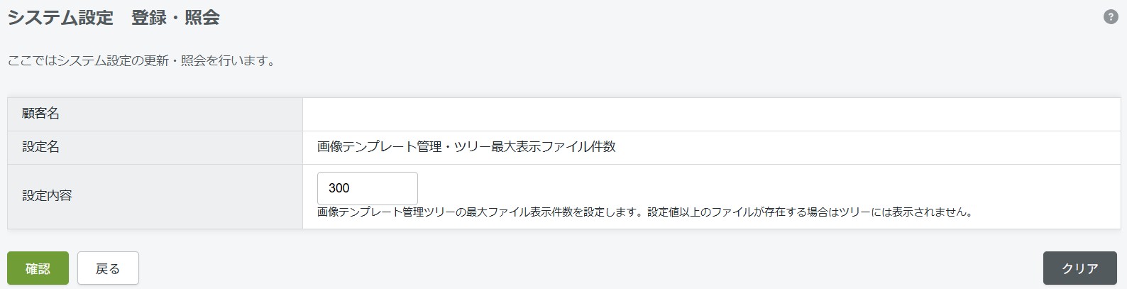 画像管理・テンプレート管理のサーバーフォルダツリーに表示するファイルの最大件数を設定します。 設定値以上のファイルが存在する場合はツリーには表示されません。 ※初期値は『300』に設定されています。 ※最大『99999999』まで設定可能です。