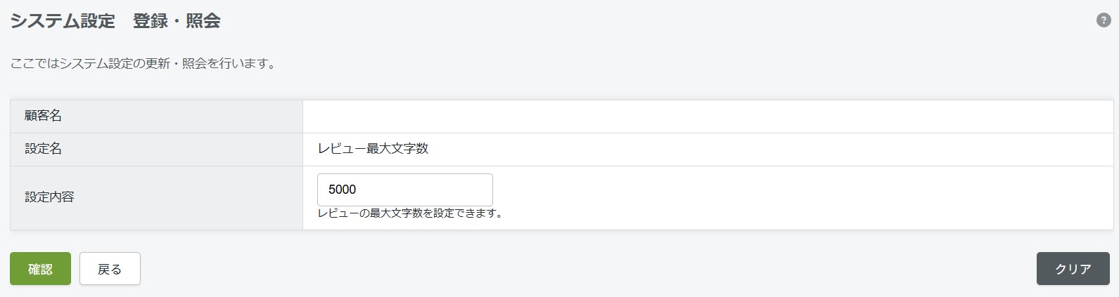 下記の順でグローバルナビゲーションからアクセスしてください。 → 「システム設定マスタ」 → 「初期設定」→「レビュー最大文字数」