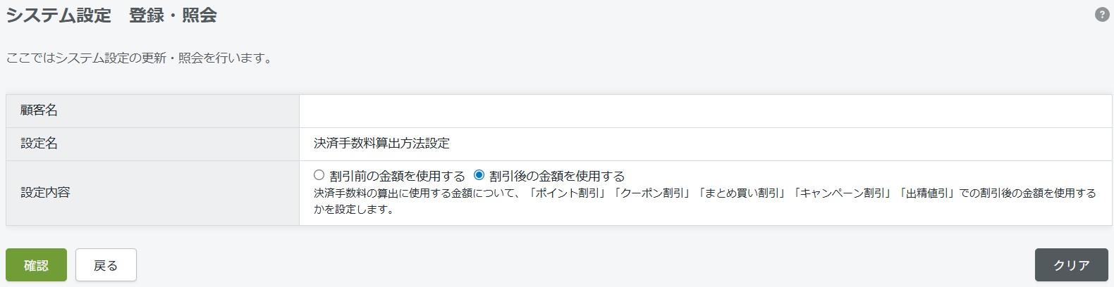 決済手数料の算出に使用する金額に対して「ポイント割引」「クーポン割引」「まとめ買い割引」 「キャンペーン割引」「出精値引」を考慮するかの設定を行います。 ※初期値は『割引後の金額を使用する』に設定されています。