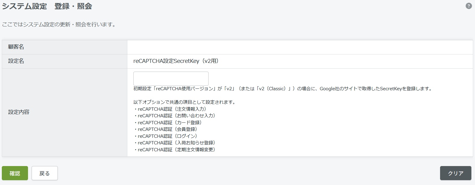 reCAPTCHA使用バージョンを「v2」または「v2(Classic)」にした場合に使用するSecretKeyを設定します。
