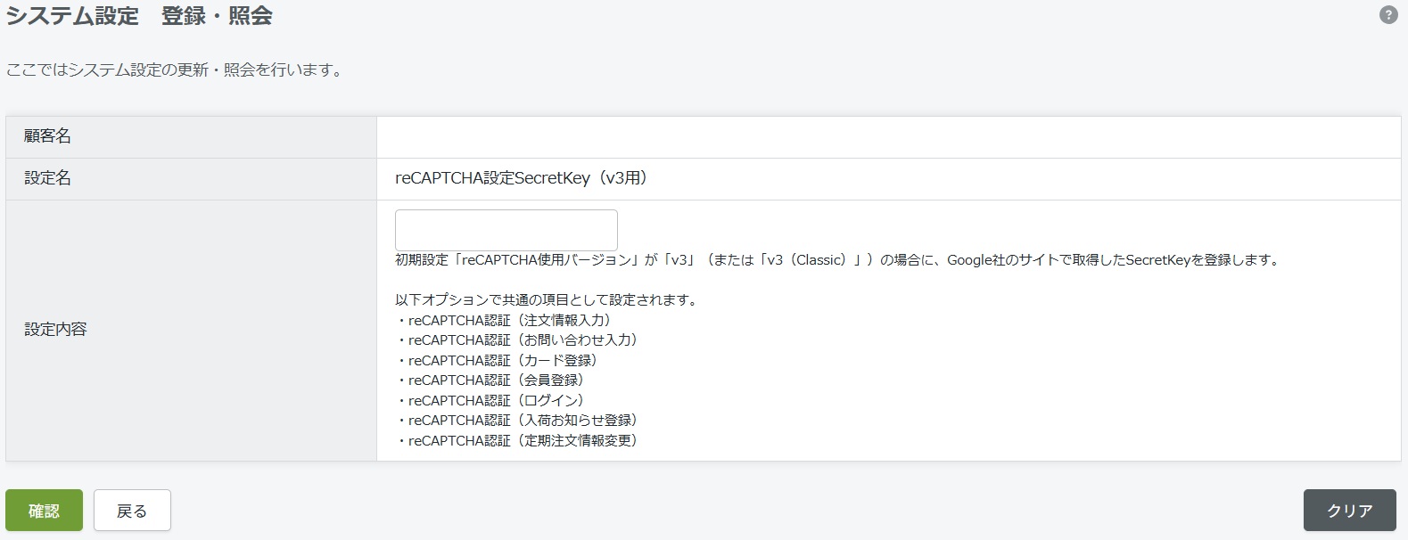 reCAPTCHA使用バージョンを「v3」または「v3(Classic)」にした場合に使用するSecretKeyを設定します。