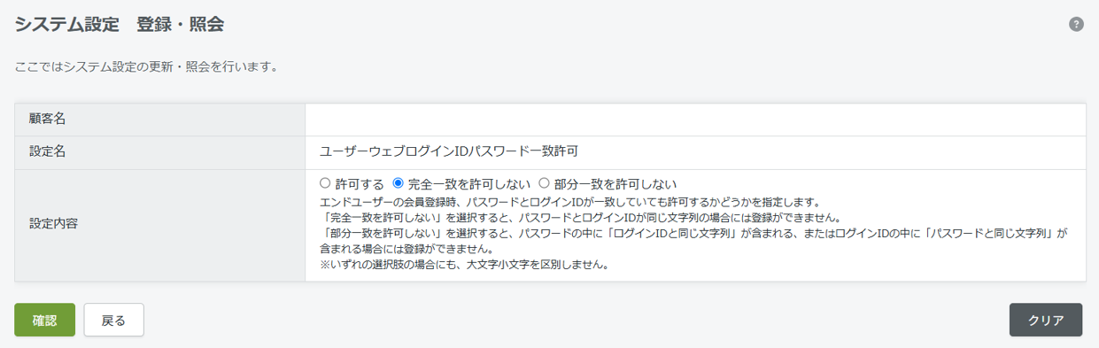 エンドユーザーの会員登録時、パスワードとログインIDが一致していても許可するかどうかを指定します。