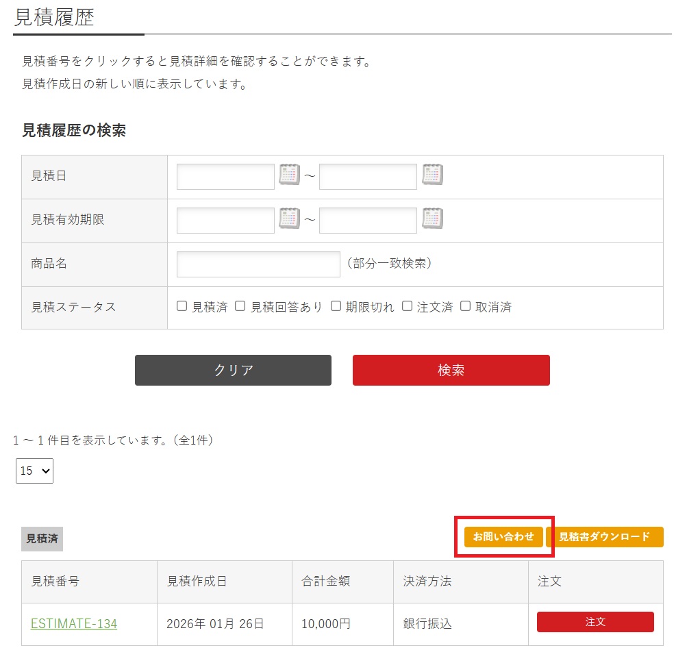 見積履歴一覧ページでは、見積履歴の表示、見積書のダウンロード、見積からの注文ができます。