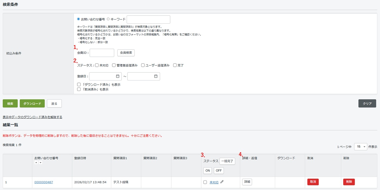 投稿データのお問い合わせ番号を検索条件に設定します。