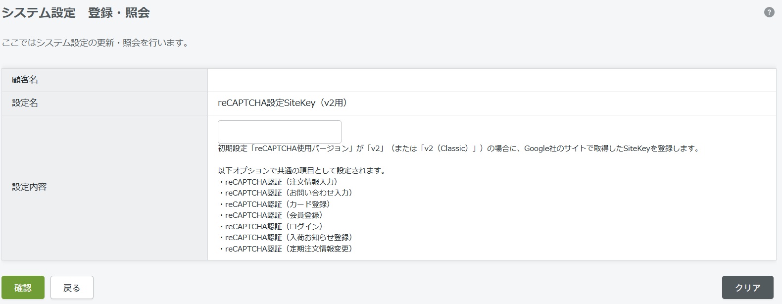 reCAPTCHA使用バージョンを「v2」または「v2(Classic)」にした場合に使用するSiteKeyを設定します。