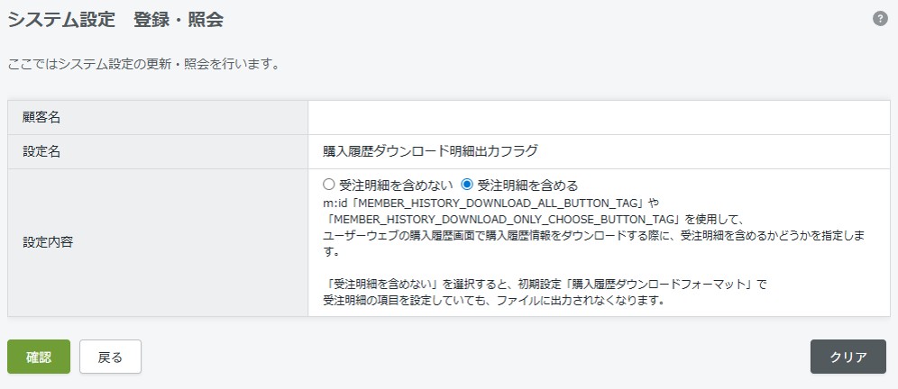 ユーザーウェブの購入履歴一覧ページ(member_history.xhtml)で購入履歴情報をダウンロードする際に、受注明細を含めるかを指定します。