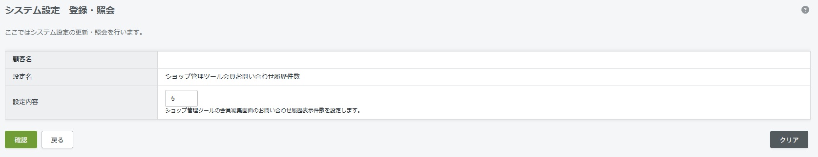 下記の順でグローバルナビゲーションからアクセスしてください。 → 「システム設定マスタ」 → 「初期設定」→「ショップ管理ツール会員お問い合わせ履歴件数」
