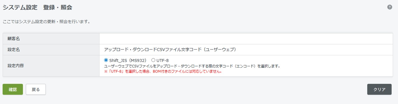 | 設定値 | アップロードするファイルの文字コード | Shift_JIS(MS932) | Shift_JIS |